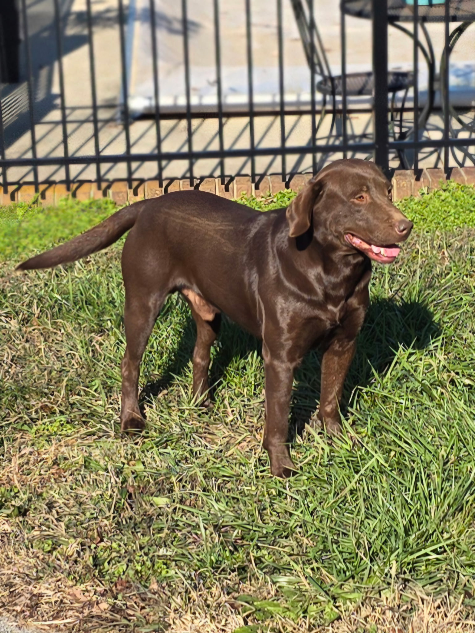Rolo is one our of AKC studs and is an English Labrador Retriever. He is an incredible animal with his beautiful chocolate coat and his docile disposition. He has wonderful people-pleasing attributes that make his pups absolute beauties to play with. He works and plays well with children and has integrated with our other animals very well. He is as laid back as a male stud could be. He seems to have pups that are also docile and makes training a snap. Rolo has made an awesome addition to our Labrador Retriever stud line.